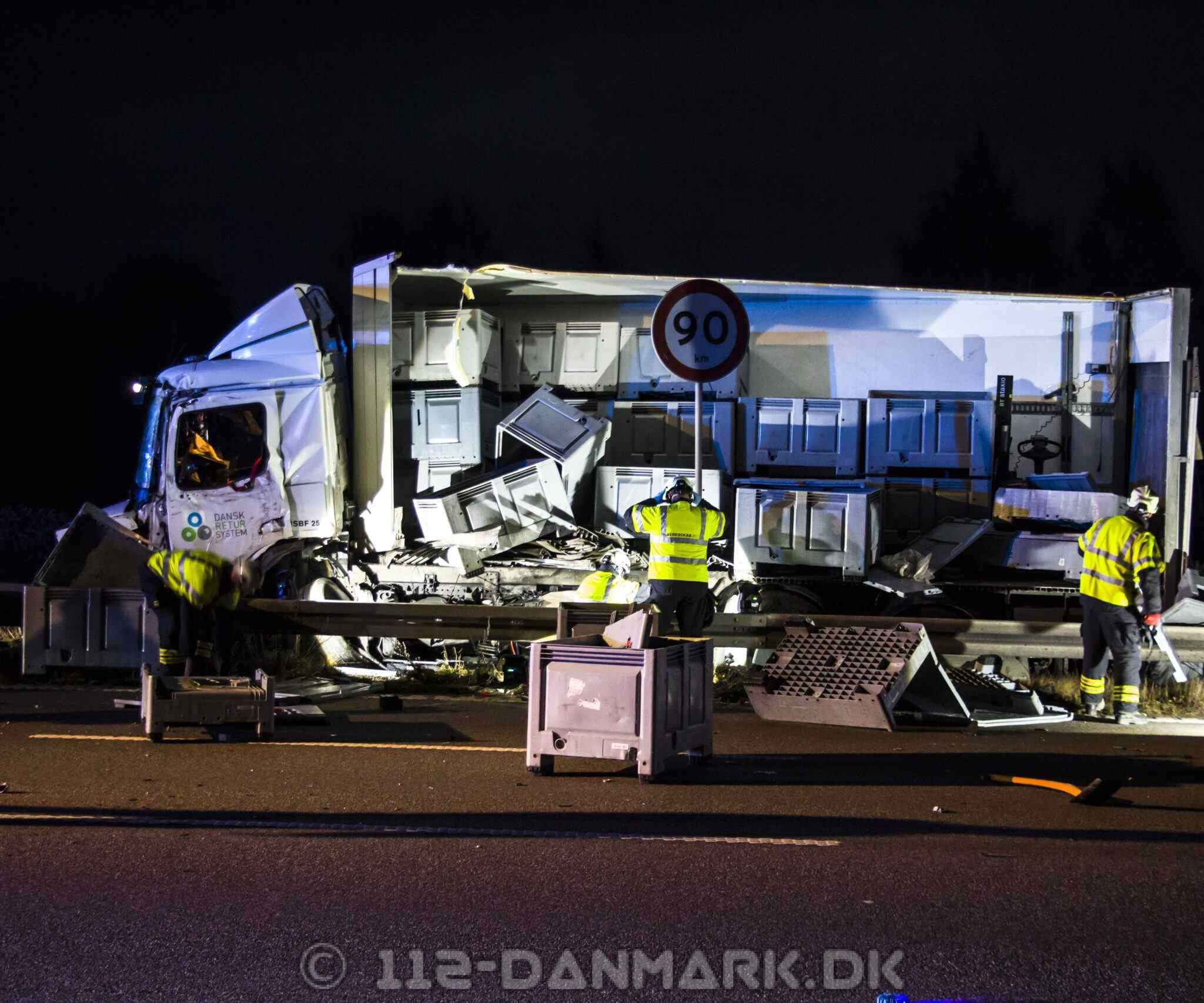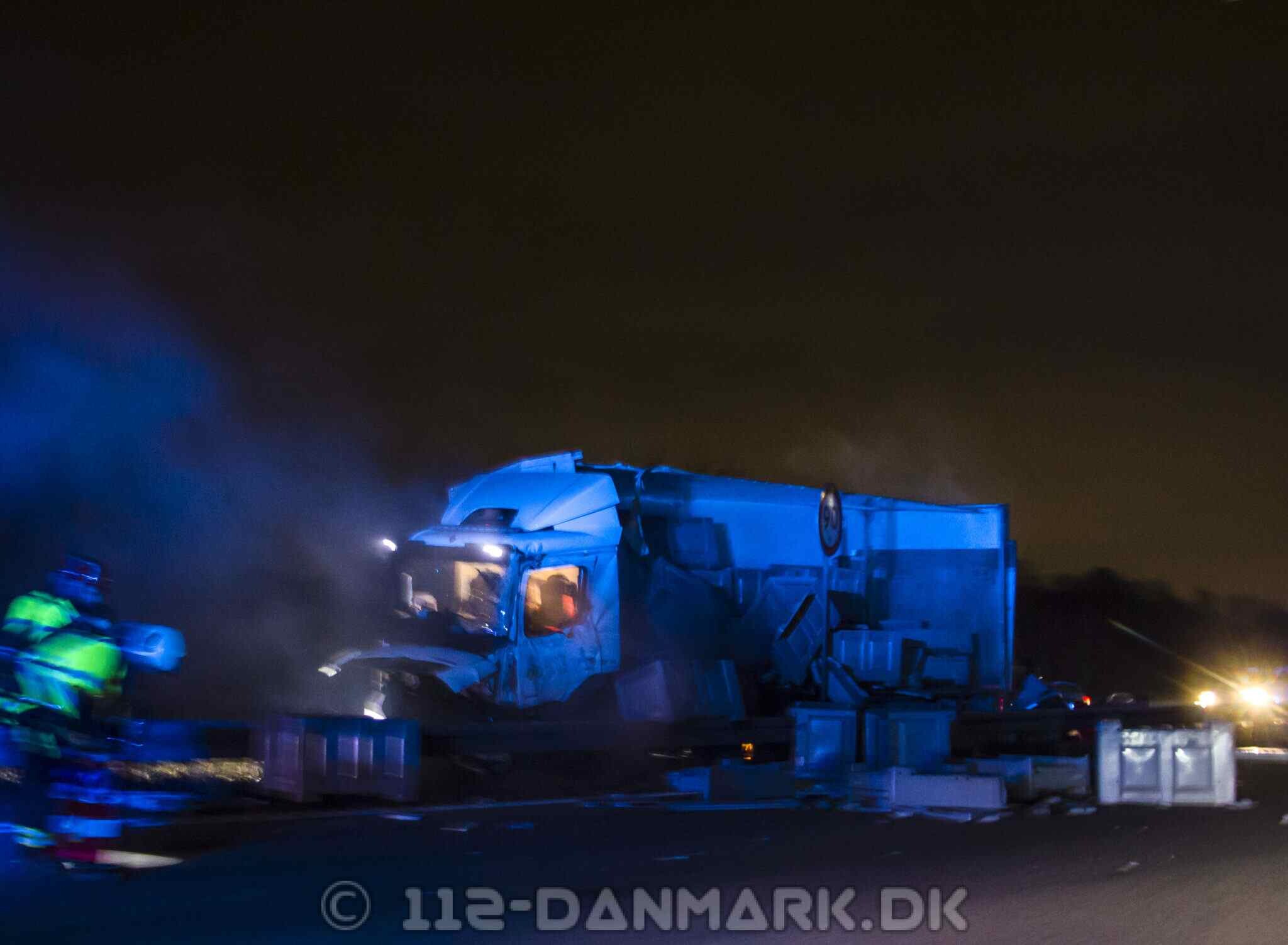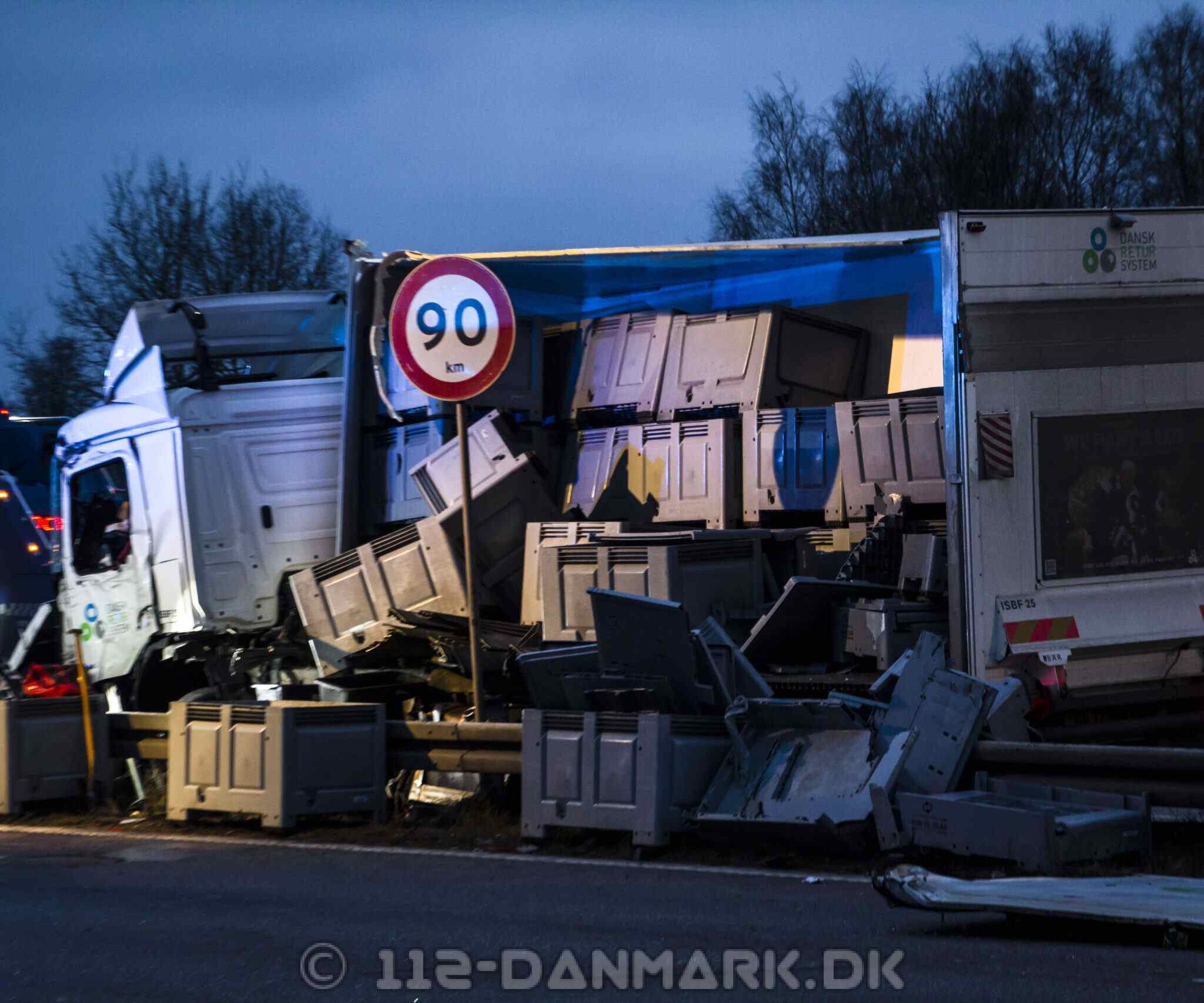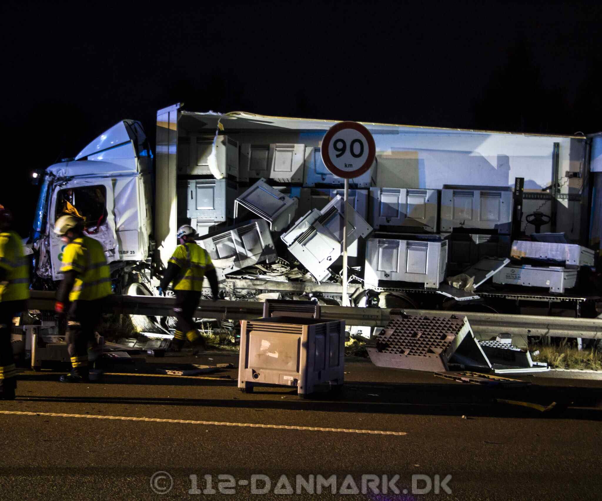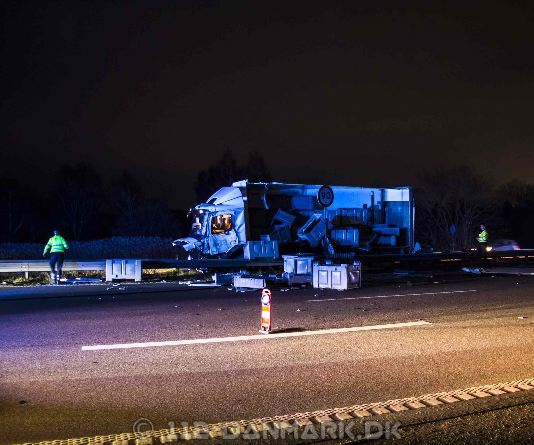 Lastbilen kørte ind i midterrabatten, hvor hele siden af køretøjet blev flået op. Dele fra lastbilen ramte efterfølgende biler i sydgående retning.