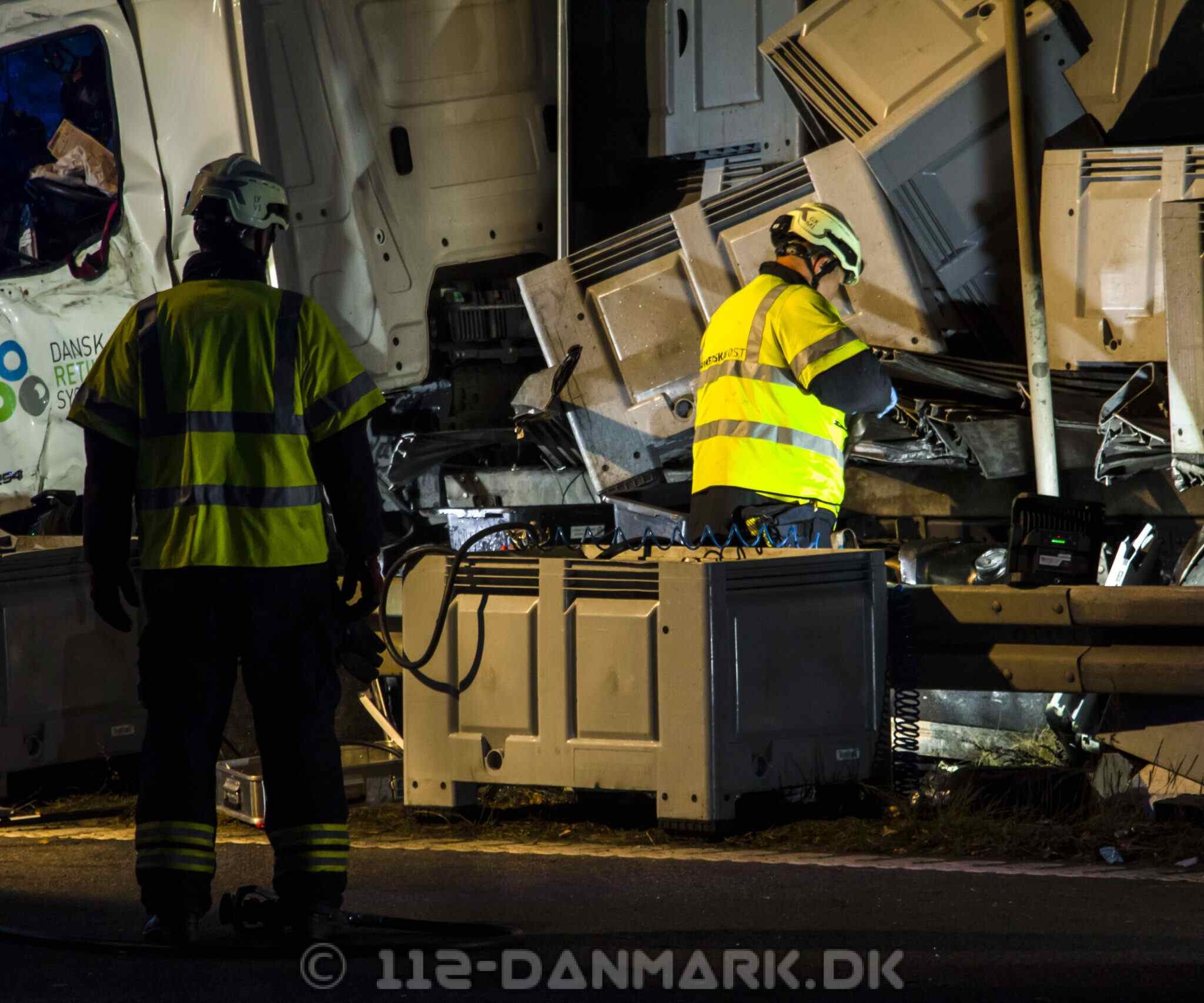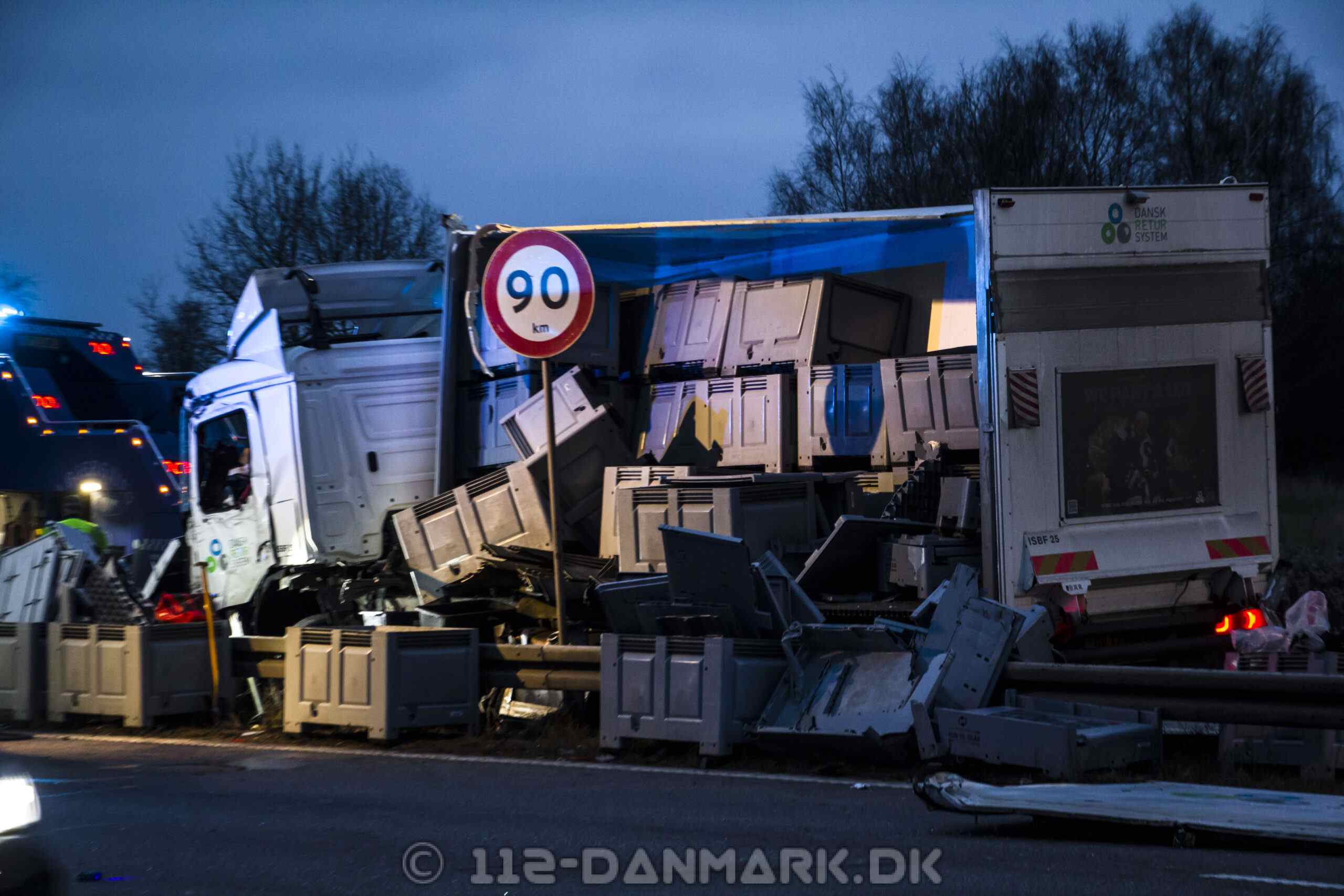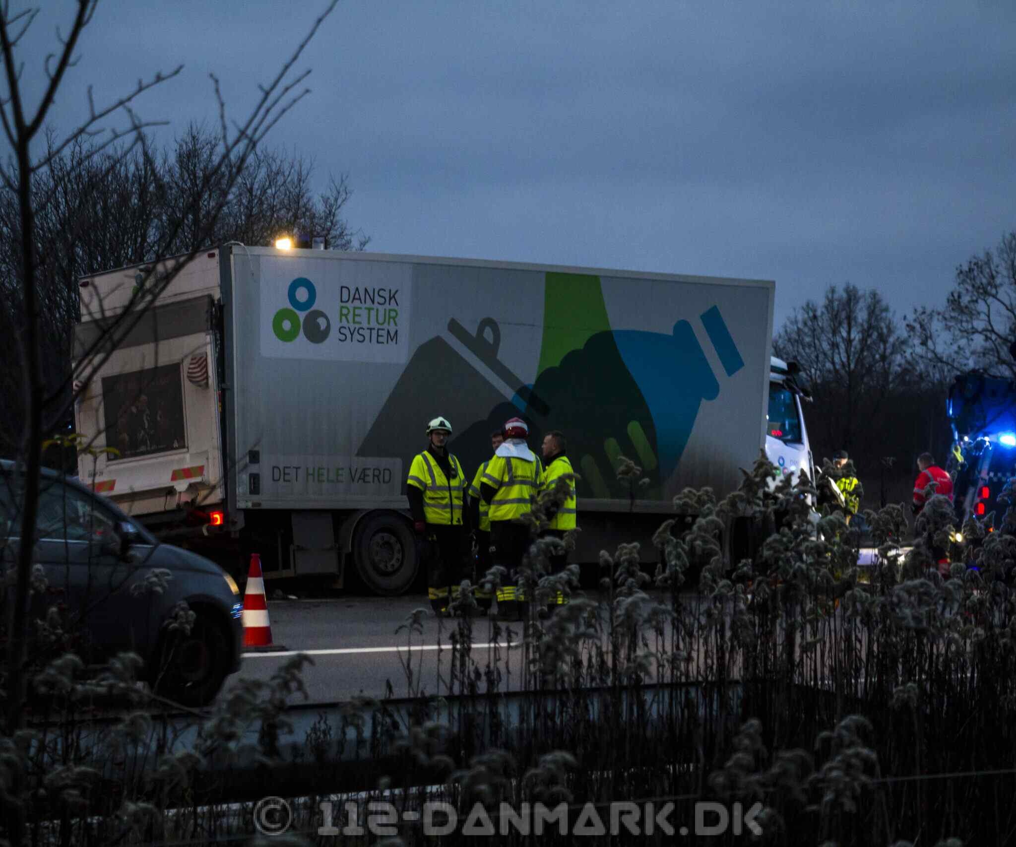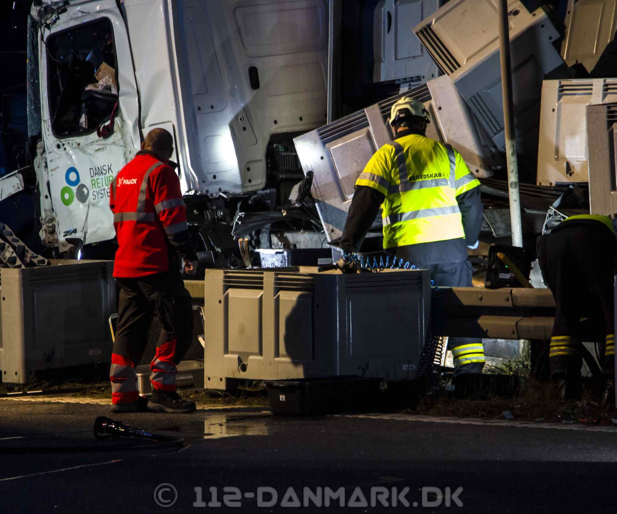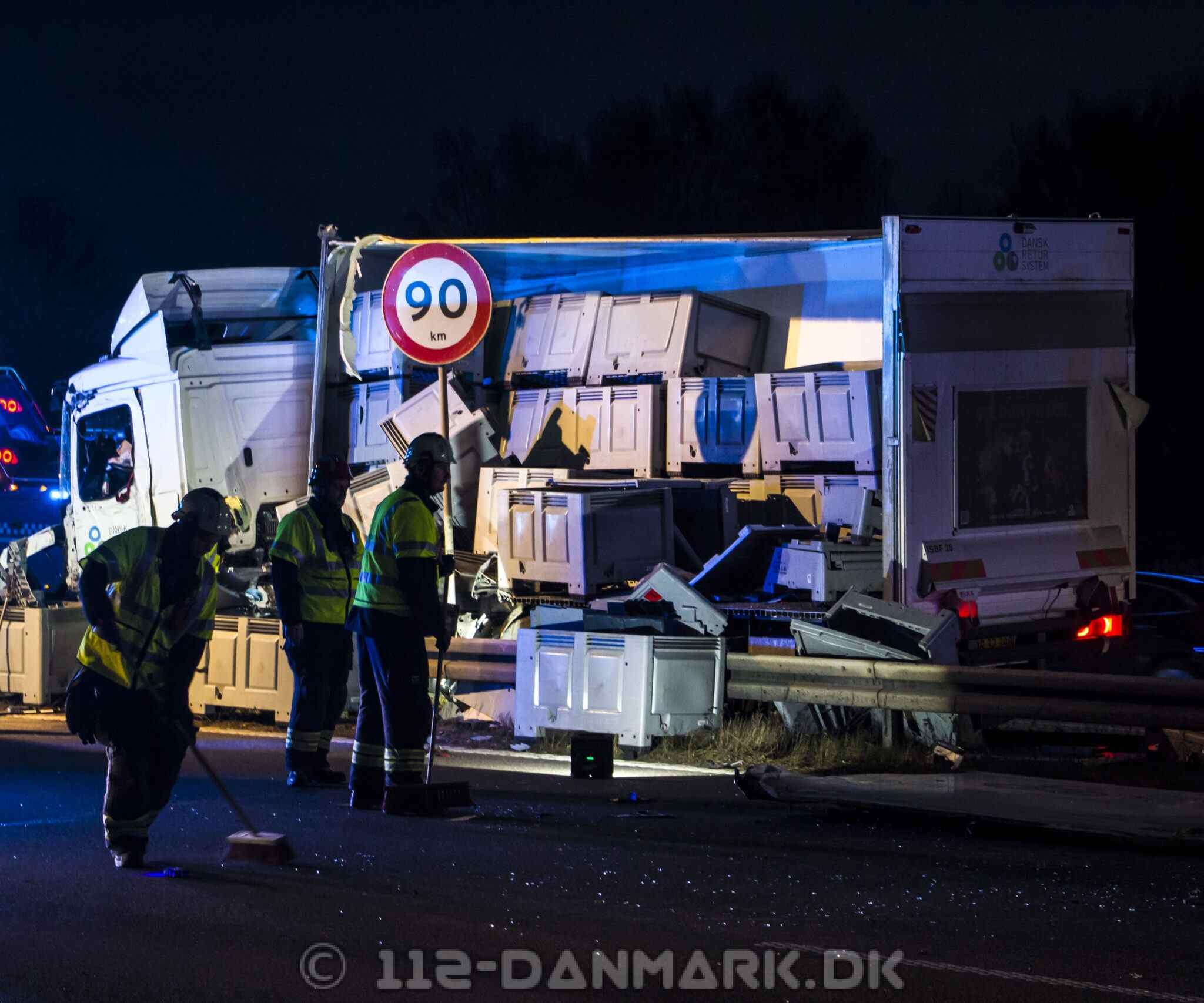 Lastbilen kørte ind i midterrabatten, hvor hele siden af køretøjet blev flået op. Dele fra lastbilen ramte efterfølgende biler i sydgående retning.